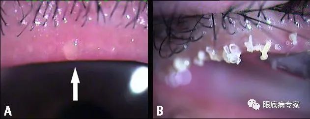 A:见上睑一睑板腺开口堵塞,油泡状半球状隆起(箭头);B:从睑板腺开口挤压出的牙膏状睑板腺分泌物
