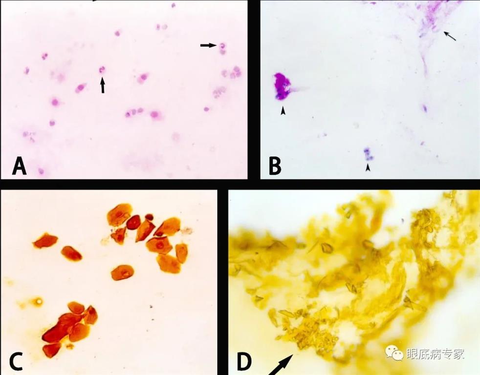 A:牙膏状睑板腺分泌物染色背景均匀,见中性粒细胞(箭),其余细胞形态不规则为变性的上皮样细胞(HE染色);B:PAS染色未见微生物,见染色不均的分泌物(箭)和变性上皮样细胞(箭头)(PAS染色);C:睑板腺分泌物涂片中正在分解的上皮细胞(GMS染色);D:睑板腺分泌物涂片彩照,分泌物染成黄色,其中含有菱形结晶体(箭)(GMS染色)