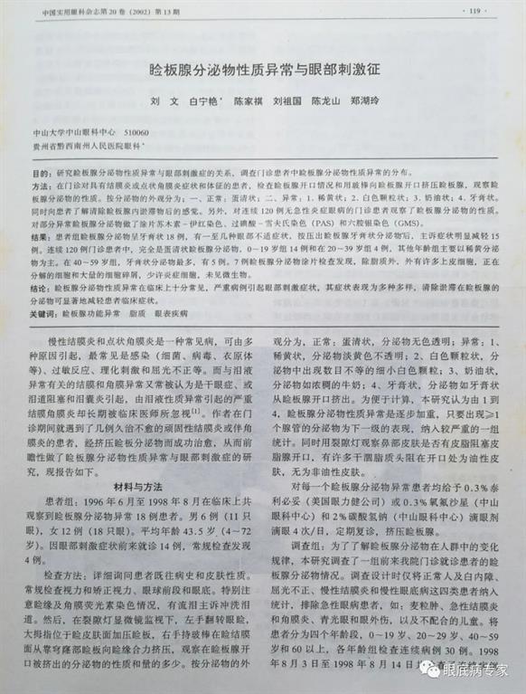 1. 刘文,白宁艳,陈家祺,刘祖国,陈龙山,郑湖玲.睑板腺分泌物性质异常与眼部刺激症.中国实用眼科杂志,2002,20(13):119-122.